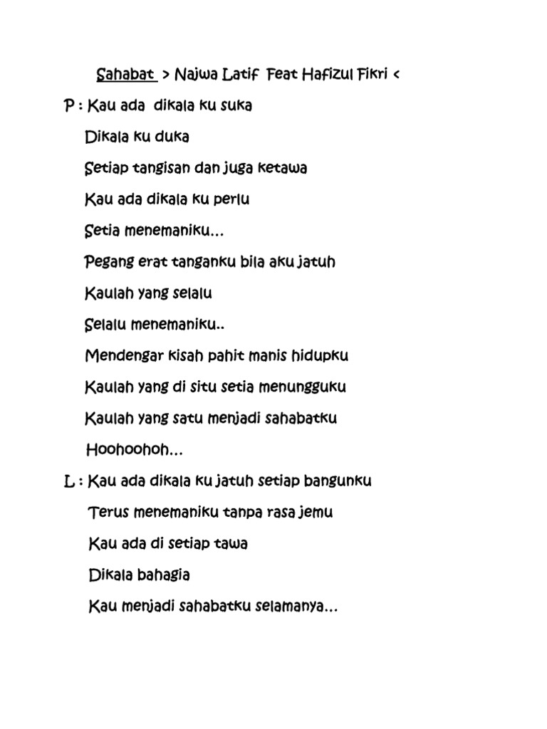Selain bisa mencairkan suasana juga bisa memperkuat persahabatan. Lirik Lagu Wajib Nasional Hymne Guru Dalam Bahasa Inggris. Di tahun 2013 lalu grup band Padi sempat merilis sebuah lagu berjudul Sahabat Selamanya yang menjadi soundtrack dari film kartun Upin Ipin.